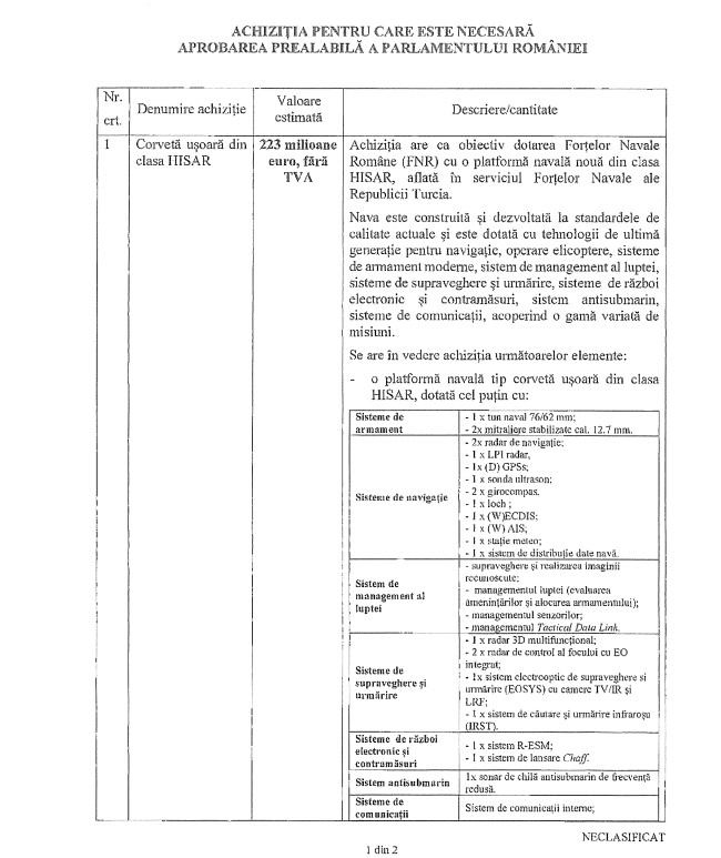 Iată ce menţionează documentele MApN despre această achiziţie :